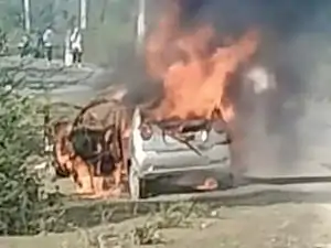 भीलवाड़ा में चलती कार में आग लगी, जलकर राख हुई:अस्पताल जा रहा था परिवार; बेटे ने मां और बहन को बाहर निकाल कर बचाई जान