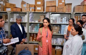 श्रीमती गिरि ने अस्पताल में औषधि भण्डार गृह एवं मुख्यमंत्री निःशुल्क दवा वितरण केन्द्रों का निरीक्षण किया। इस दौरान उन्होंने प्रत्येक दवा काउंटर पर जाकर दवाइयों का स्टॉक जांचा और दवाइयों की समुचित उपलब्धता रखने के निर्देश दिए। प्रबंध निदेशक ने दवा वितरण केन्द्रों पर ई-औषधि सॉफ्टवेयर पर दवाइयों की उपलब्धता, एक्सपायरी डेट और सॉफ्टवेयर की तकनीकी जानकारी भी ली। इस दौरान उन्होंने सॉफ्टवेयर में आ रही तकनीकी खामी को तत्काल प्रभाव से दूर करने के लिए सूचना प्रौद्योगिकी विभाग के कार्मिकों को निर्देश दिए।