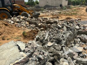 इसी प्रकार जोन-14 के क्षेत्राधिकार में अवस्थित ग्राम कीलकीपुरा में षिवदासपुरा जाने वाली रोड़ पर जिला जयपुर में करीब 04 बीघा निजी खातेदारी कृषि भूमि पर जेडीए की बिना स्वीकृति-अनुमोदन के एवं बिना भू रूपान्तरण करवायें भूमि को समतल कर विगत दिवसों में मौका पाकर रातों-रात बनाई गई मिट्टी-ग्रैवल सड़कें,पत्थरगढ़ी व अन्य अवैध निर्माण कर नवीन अवैध कॉलोनी बसाने की सूचना प्राप्त होते ही प्रारंभिक स्तर पर ही आज जोन-14 के राजस्व व तकनीकी स्टॉफ की निशादेही पर प्रवर्तन दस्ते द्वारा जेसीबी मशीन व मजदूरों की सहायता से ध्वस्त किया जाकर नवीन अवैध कॉलोनी बसाने के प्रयास को विफल किया गया।संबंधित से जेडीए के ध्वस्तीकरण की कार्यवाही का नियमानुसार खर्चा-वसूली की कार्यवाही सुनिश्चित की जायेगी। जोन-14 के क्षेत्राधिकार में अवस्थित ग्राम पदमपुरा रोड़ जिला जयपुर में करीब 03 बीघा निजी खातेदारी कृषि भूमि पर जेडीए की बिना स्वीकृति-अनुमोदन के एवं बिना भू रूपान्तरण करवायें भूमि को समतल कर ‘‘शिव शक्ति नगर’’के नाम से विगत दिवसों में मौका पाकर रातों-रात बनाई गई मिट्टी-ग्रैवल सड़कें,पत्थरगढ़ी व अन्य अवैध निर्माण कर नवीन अवैध कॉलोनी बसाने की सूचना प्राप्त होते ही प्रारंभिक स्तर पर ही आज जोन-14 के राजस्व व तकनीकी स्टॉफ की निशादेही पर प्रवर्तन दस्ते द्वारा जेसीबी मशीन व मजदूरों की सहायता से ध्वस्त किया जाकर नवीन अवैध कॉलोनी बसाने के प्रयास को विफल किया गया।संबंधित से जेडीए के ध्वस्तीकरण की कार्यवाही का नियमानुसार खर्चा-वसूली की कार्यवाही सुनिश्चित की जायेगी।