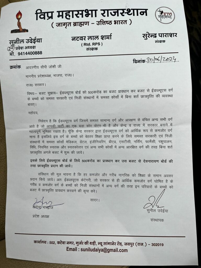 विप्र महासभा के संस्थापक सुनील उदेईया,प्रदेश संयोजक पंकज जोशी और परशुराम सेना के अध्यक्ष अनिल चतुर्वेदी ने प्रतिनिधिमण्डल के साथ बीजेपी प्रदेश अध्यक्ष सीपी जोशी से मिल कर माँग की कि ईडब्ल्यूएस वर्ग जिसमें समस्त सामान्य वर्ग और आरक्षण से वंचित अन्य सभी वर्ग आते है जो आपकी पार्टी का एक बडा कोर वोटर भी है और केन्द्र व राज्य में सरकार बनाने में महत्वपूर्ण भूमिका रखता है।चूँकि केन्द्र सरकार द्वारा ईडब्ल्यूएस वर्ग को आर्थिक रूप से कमजोर वर्ग माना है इसलिये इस वर्ग के बच्चों को बेहतर शिक्षा प्राप्त करने के लिये समस्त सरकारी एवं निजी संस्थानों में समस्त कोर्सो मेडिकल, डेंटल,इंजीनियरिंग,बीएड,एसटीसी, नर्सिंग,फार्मेसी,पशुपालन,विधि, नियमित स्नातक और स्नातकोत्तर एवं अन्य सभी कोर्सों में अन्य आरक्षित वर्ग की तरह बिना शर्त छात्रवृत्ति अगले बजट में शुरू की जाये।इससे पूर्व मुख्यमंत्री और उप मुख्यमंत्री दिया कुमारी को भी इस बाबत ज्ञापन दिया जा चुका है।साथ ही भाजपा प्रदेश अध्यक्ष सीपी जोशी को अवगत भी कराया गया की ईडब्ल्यूएस बोर्ड के लिये 500 करोड का प्रावधान कर उस बजट से देवनारायण बोर्ड की तरह छात्रवृत्ति प्रदान की जाये जिससे कई ऐसे विद्यार्थी जो पैसे के आवाव में अपने सपनों को साकार नही कर पाते उनको भी मदद मिले इस दौरान उन्होंने कहा कि संविधान की मूल भावना है कि हर कमजोर और गरीब नागरिक को शिक्षा के समान अवसर प्रदान किये जाये।अतःईडब्लयूएस केटेगरी,जो सरकार से ही आर्थिक कमजोर वर्ग घोषित है के गरीब व कमजोर वर्ग के बच्चों को निजी संस्थानों में अन्य वर्ग की तरह इन परिवारों के बच्चों को बजट में छात्रवृत्ति प्रावधान करवाये।