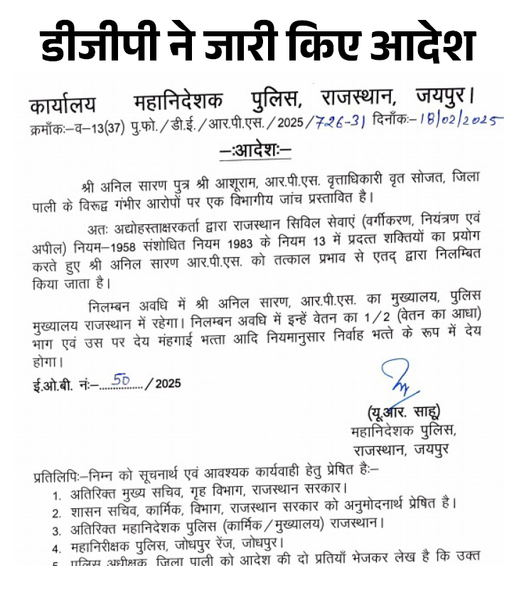 पुलिस महानिदेशक यूआर साहू की ओर से जारी आदेश के तहत निलंबित होने के बाद डीएसपी अनिल सारण का मुख्यालय जयपुर किया गया है।