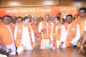 जयपुर (सुनील शर्मा) भाजपा प्रदेश कार्यालय पर आज प्रदेश के वरिष्ठ नेताओं ने भाजपा परिवार में वापसी की।प्रधानमंत्री नरेन्द्र मोदी के ऐतिहासिक विकास कार्यों, जनकल्याणकारी नीतियों पर विश्वास जताते हुए बिना किसी शर्त के भाजपा में पुनःशामिल हुए।