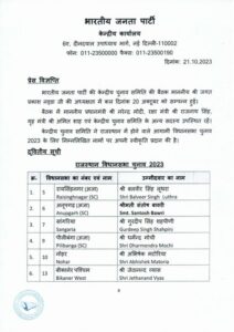जयपुर: राजस्थान विधानसभा चुनाव के मद्देनजर बीजेपी ने अपनी दूसरी सूची जारी कर दी है. इसे लेकर नई दिल्ली में 20 अक्टूबर को पार्टी की केंद्रीय चुनाव समिति की बैठक हुई थी. करीब डेढ़ घंटे तक चली इस बैठक में फैसला किया गया था.