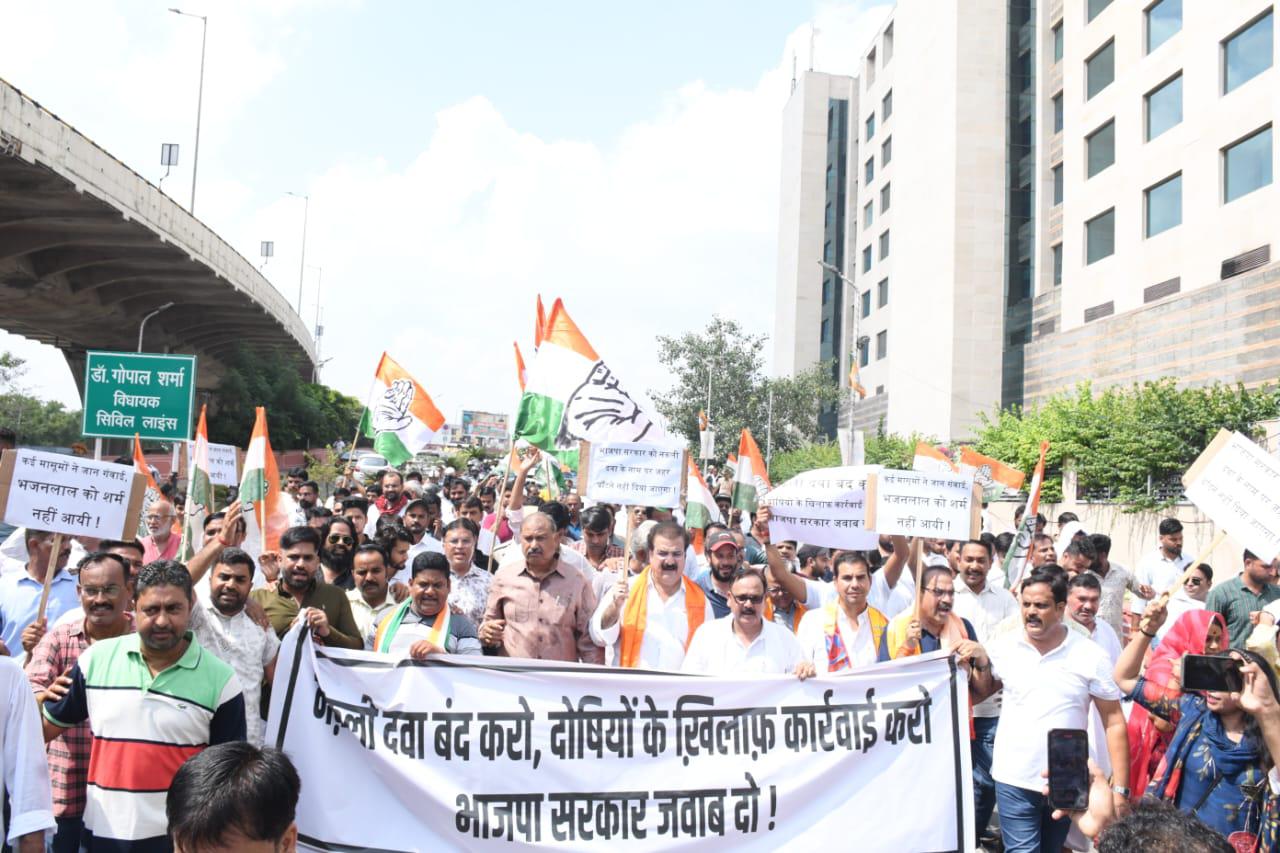 पूर्व मंत्री प्रताप सिंह खाचरियावास ने आज स्वास्थ्य भवन सचिवालय के सामने सैकड़ो कांग्रेस कार्यकर्ताओं को संबोधित करते हुए कहा कि राज्य की भाजपा सरकार भ्रष्टाचार की नकली दवा बेच रही है जिसको पीने से चार बच्चों की मौत हो गई,राज्य सरकार को भ्रष्टाचार की नकली दवा के कारण हो रही मौत की जांच के लिए न्यायिक आयोग बिठाना चाहिए मुख्यमंत्री भजनलाल शर्मा और स्वास्थ्य मंत्री बार-बार बयान बदल रहे हैं पहले कहा था कंपनी जिम्मेदार है अधिकारी जिम्मेदार है अब कह रहे हैं कोई भी जिम्मेदार नहीं है इन पौने दो वर्षों में भाजपा सरकार में नकली दवा पीने से कितने लोगों की मौत हुई है वह न्यायिक जांच से ही सामने आ सकता है नकली दवा से हुई मौत को छुपाने का भाजपा सरकार का कोई भी काम सफल नहीं होने दिया जाएगा नकली दवा से हुई मौत से पूरे राजस्थान में आक्रोश व्याप्त है नकली दवा के नाम पर जहर नहीं बांटा जा सकता पिछले डेढ़ वर्ष से हम कह रहे हैं दवा खरीद में घोटाला हो रहा है फिर भी भ्रष्टाचार की पट्टी भाजपा सरकार की आंखों पर बंदी रही खाचरियावास ने कहा कि इस मामले में राज्य सरकार के खिलाफ पूरे राजस्थान में कांग्रेस सड़कों पर संघर्ष करेगी जयपुर में अगला कदम मुख्यमंत्री निवास के घेराव का होगा इस मामले में जब तक सरकार अपनी गलती स्वीकार करके दोषियों के विरुद्ध कार्रवाई नहीं करेगी और जिन लोगों की मौत हुई उनको मुआवजा नहीं देगी तब तक कांग्रेस का आंदोलन जारी रहेगा खाचरियावास ने कहा कि बड़ी-बड़ी बातें करने वाली भाजपा सरकार नकली दवा के नाम पर जहर बेच रही है अब पर्दा नहीं डाला जा सकता सड़कों पर आर पार का संघर्ष होगा लेकिन भाजपा सरकार के घुटने टिककर नकली दवाई का पूरा भ्रष्टाचार सामने लेकर आएंगे आज सुबह पूर्व मंत्री प्रताप सिंह खाचरियावास अपने हाउस से सैकड़ो कांग्रेस कार्यकर्ता और विधायक रफीक खान,अमीन कागजी,गंगा देवी,पुष्पेंद्र भारद्वाज,जयपुर के पार्षद कांग्रेस के ब्लॉक अध्यक्ष वार्ड अध्यक्ष और बड़ी तादाद में हजारों की तादाद में उपस्थित लोगों के साथ पैदल शासन सचिवालय के सामने स्थित स्वास्थ्य भवन पहुंचे और नकली दवा के कारण हो रही मौत के विरोध में जबरदस्त प्रदर्शन किया प्रदर्शन के कारण प्रशासन में हड़कंप मच गया क्योंकि यह प्रदर्शन आज सुबह ही अचानक किया गया और इस दौरान हजारों लोगों के इकट्ठा हो जाने से जयपुर का प्रशासन हक्का-बक्का रह गया लेकिन नकली दवा के विरोध में लोगों में भारी आक्रोश व्याप्त था।