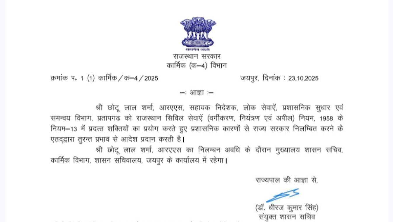 कार्मिक विभाग ने गुरुवार देर रात इसका आदेश जारी किया। सस्पेंशन के दौरान RAS अधिकारी छोटूलाल शर्मा का मुख्यालय जयपुर सचिवालय में रहेगा।
