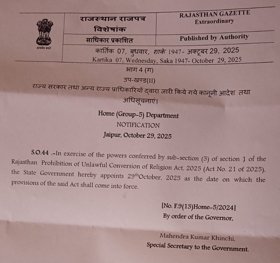 गृह विभाग ने आज धर्मांतरण विरोधी कानून को लागू करने का नोटिफिकेशन जारी कर दिया है। इस नोटिफिकेशन के साथ ‘ राजस्थान प्रोहिबिशन ऑफ अनलॉफुल कन्वर्जन ऑफ रिलिजन एक्ट 2025’ के प्रावधान तत्काल प्रभाव से लागू हो गए हैं।