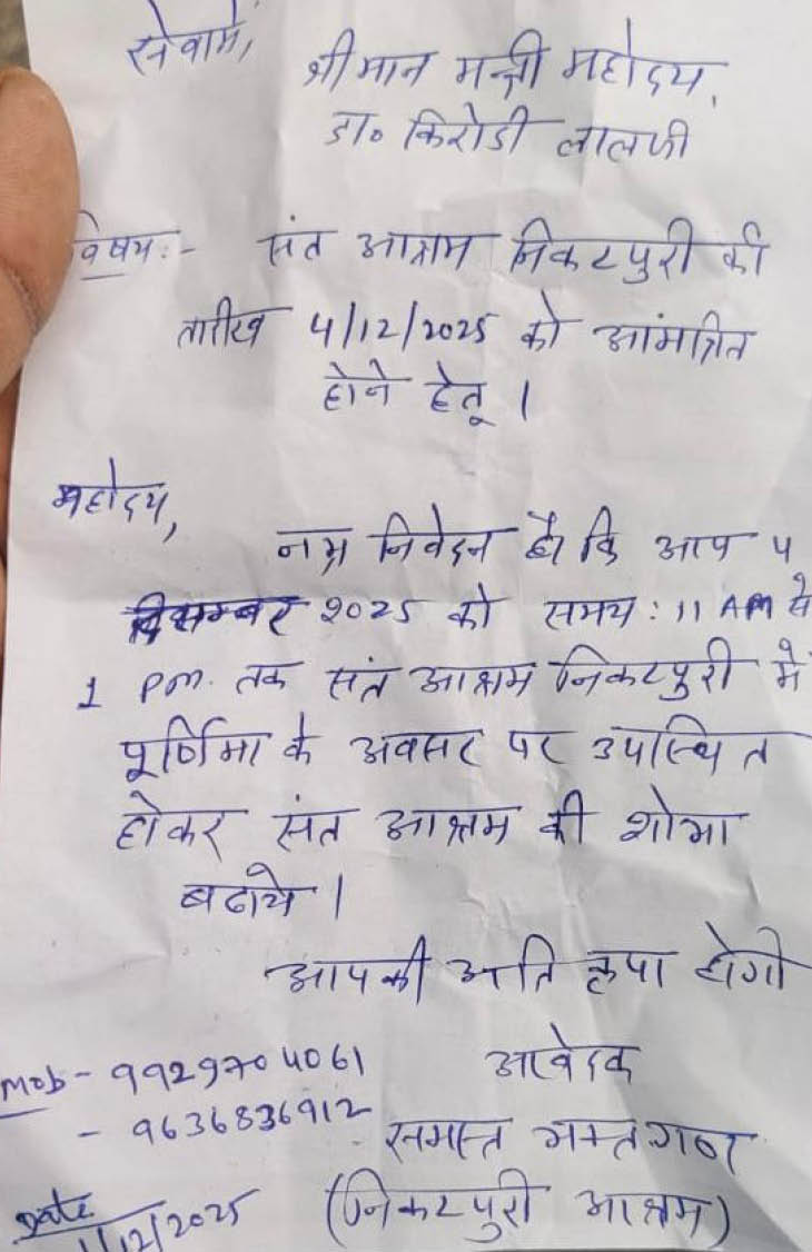 कृषि मंत्री किरोड़ी लाल मीणा ने एक फरियादी महिला को गोशाला की जमीन पर अतिक्रमण न होने का आश्वासन दिया। उन्होंने महिला के हाथ पर ही लिखकर यह आदेश दिया कि कोई भी गोशाला के काम को नहीं रोकेगा और वे 4 तारीख को संत आश्रम निकट पुरी सिकराय दौसा गोशाला पहुंचेंगे। आश्रम में 4 दिसंबर को पूर्णिमा के अवसर पर कार्यक्रम रखा गया है, जिसमें मंत्री किरोड़ी लाल मीणा को न्योता दिया गया है।