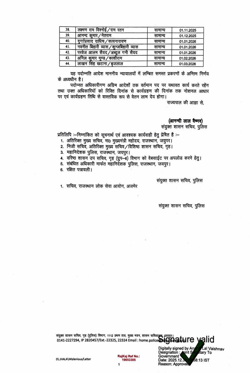 राजस्थान के 44 इंस्पेक्टरों को नए साल पर प्रमोशन का तोहफा मिला है। पुलिस निरीक्षक RPS अधिकारी बन जाएंगे। गृह विभाग के संयुक्त शासन सचिव आनंदी लाल वैष्णव ने आदेश जारी किए हैं। इसमें जयपुर ग्रामीण के चौमूं थाने के SHO प्रदीप शर्मा का भी नाम शामिल है।