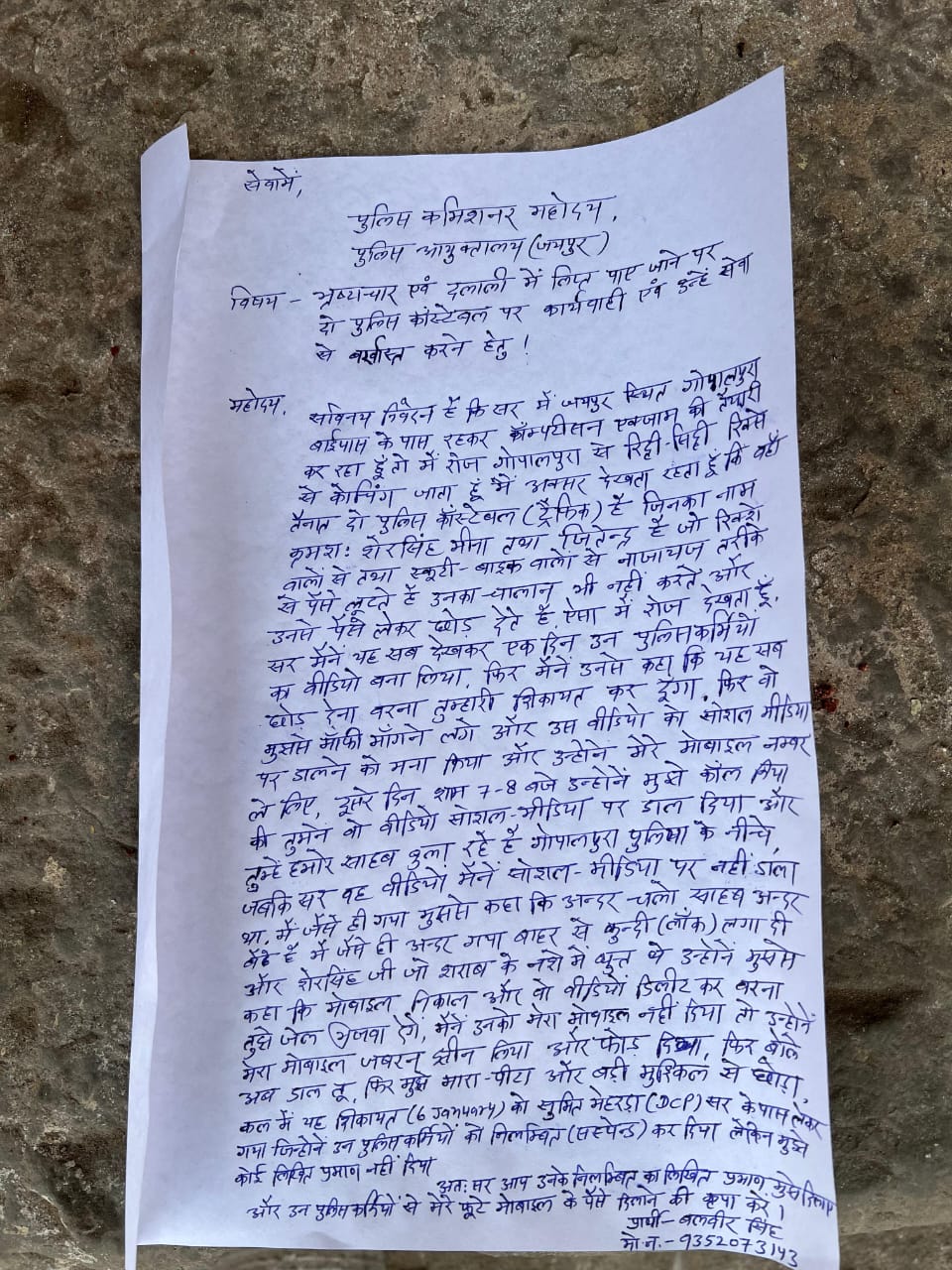 पीड़ित युवक के अनुसार- वह गोपालपुरा बाइपास के पास रहकर प्रतियोगी परीक्षाओं की तैयारी करता है। वह रोजाना कोचिंग के लिए गोपालपुरा से रिद्धी-सिद्धी मोड़ से गुजरता है। इस दौरान उसने वहां तैनात ट्रैफिक पुलिस कॉन्स्टेबल शेरसिंह मीणा और जितेंद्र को ऑटो रिक्शा ड्राइवरों और स्कूटी-बाइक ड्राइवरों से बिना चालान किए अवैध रूप से रुपए वसूलते हुए कई बार देखा था। आरोप है कि दोनों कॉन्स्टेबल चालान की कार्रवाई किए बिना ही वाहन ड्राइवरों से रिश्वत लेकर उन्हें छोड़ देते थे।