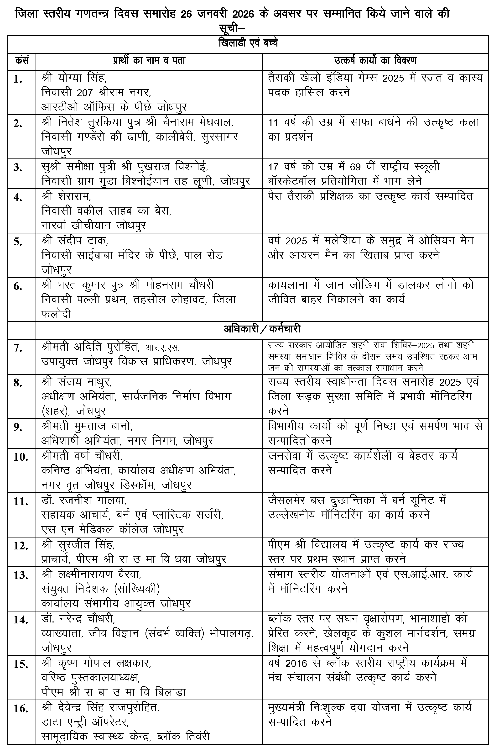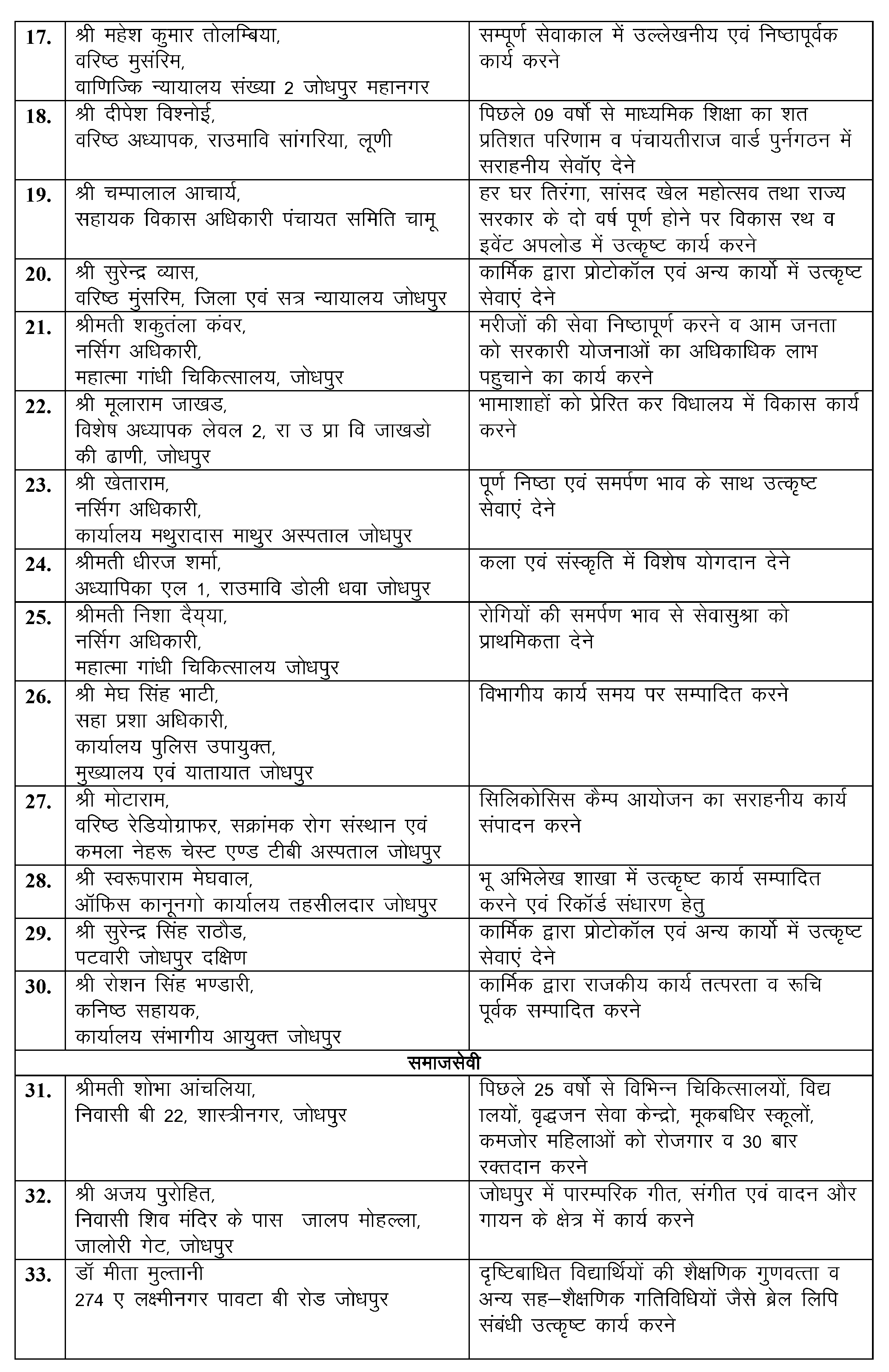 मुख्य समारोह के दौरान विभिन्न क्षेत्रों में उल्लेखनीय और उत्कृष्ट कार्य करने वाले 39 लोगों का सम्मान किया गया। इनमें सरकारी विभागों व भामाशाहों व समाजसेवियों को प्रशस्ति पत्र प्रदान कर उनका अभिनंदन किया गया।