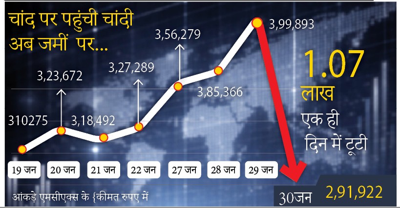 इस तरह 10 दिन में चांदी एक लाख रुपए रुपए प्रतिकिलो से ज्यादा महंगी हुई, लेकिन शुक्रवार को अंतरराष्ट्रीय बाजार में अप्रत्याशित गिरावट से एमसीएक्स में एक दिन में चांदी 1 लाख 7,971 रुपए गिरकर 2 लाख 91,922 रुपए किलो रह गई। गिरावट रोकने के लिए एमसीएक्स में कई बार 9% का लोअर सर्किट लगा। सोना भी करीब 15 हजार रु. लुढ़ककर 1.50 लाख रु. प्रति 10 ग्राम से नीचे आ गया। सोने और चांदी में अचानक गिरावट से बुलियन डीलर सकते हैं।