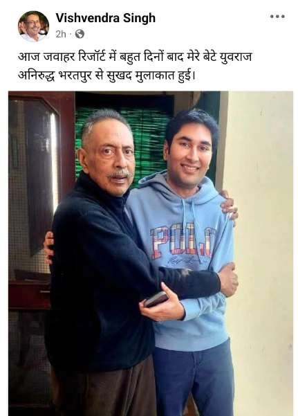भरतपुर के पूर्व राजपरिवार के सदस्य और पूर्व मंत्री विश्वेन्द्र सिंह ने करीब पांच साल बाद बेटे अनिरुद्ध सिंह के साथ सोशल मीडिया पर फोटो अपलोड किया है। कैप्शन लिखा- ‘आज जवाहर रिजॉर्ट में बहुत दिनों बाद मेरे बेटे युवराज अनिरुद्ध भरतपुर से सुखद मुलाकात हुई।’