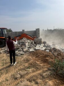 महानिरीक्षक पुलिस राहुल कोटोकी ने बताया जोन-14 के क्षेत्राधिकार में अवस्थित ग्राम रामसिंहपुरा,बैरवाओं की ढ़ाणी,जिला जयपुर में करीब 2 बीघा निजी खातेदारी कृषि भूमि पर जेडीए की बिना स्वीकृति-अनुमोदन के एवं बिना भू रूपान्तरण करवायें भूमि को समतल कर बनाई गई प्लॉटों की बाउण्ड्रीवाल, ट्रीगार्ड,व अन्य अवैध निर्माण कर नवीन अवैध कॉलोनी बसाने की सूचना प्राप्त होने पर महानिरीक्षक राहुल कोटोकी के निर्देषन में आज जोन 14 के राजस्व व तकनीकी स्टॉफ की निशादेही पर प्रवर्तन दस्ते द्वारा जेसीबी मशीन व मजदूरों की सहायता से प्रारिम्भक स्तर पर ही ध्वस्त किया जाकर नवीन अवैध कॉलोनी बसाने के प्रयास को विफल किया गया। जोन 14 के क्षेत्राधिकार में अवस्थित ग्राम रामसिंहपुरा,जिला जयपुर में ही करीब 4 बीघा निजी खातेदारी कृषि भूमि पर जेडीए की बिना स्वीकृति-अनुमोदन के एवं बिना भू रूपान्तरण करवायें भूमि को समतल कर बनाई गई ग्रेवल सड़कें,प्लॉटों की बाउण्ड्रीवाल व अन्य अवैध निर्माण कर नवीन अवैध कॉलोनी बसाने की सूचना प्राप्त होने पर महानिरीक्षक राहुल कोटोकी के निर्देषन में आज जोन 14 के राजस्व व तकनीकी स्टॉफ की निशादेही पर प्रवर्तन दस्ते द्वारा जेसीबी मशीन व मजदूरों की सहायता से प्रारिम्भक स्तर पर ही ध्वस्त किया जाकर नवीन अवैध कॉलोनी बसाने के प्रयास को विफल किया गया।