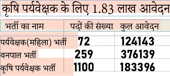 वहीं महिला पर्यवेक्षक भर्ती में 1,24,143 अभ्यर्थियों ने आवेदन किए। इस भर्ती में प्रति पद 1724 अभ्यर्थियों में टक्कर रहेगी। कृषि पर्यवेक्षक के लिए 1,83,396 आवेदन आए। इस कारण इस भर्ती में एक पद पर 167 अभ्यर्थियों के बीच ही मुकाबला है। अब दो भर्तियां एलडीसी और लैब असिस्टेंट के लिए आवेदन की प्रक्रिया चल रही है। इन सभी 5 भर्तियों में पदों की संख्या 12,879 है।