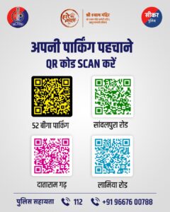 धाम पर प्रतिदिन पहुंचने वाले करीब 25 हजार से अधिक वाहनों की पार्किंग के लिए चार बड़े नि:शुल्क पार्किंग स्थल विकसित किए गए हैं, जिन्हें रंग-कोडेड जोन में विभाजित किया गया है। इसके तहत बावन बीघा पार्किंग को पीले रंग में, सांवलपुरा पार्किंग को हरा, लामिया रोड़ पार्किंग को नीला और दातारामगढ़ पार्किंग को गुलाबी रंग कोड दिया गया है और इनके क्यूआर कोड तैयार कर प्रसारित किए जा रहे हैं ताकि बाहर से आने वाले श्रद्धालु आसानी से अपने वाहन यहां पा​र्क कर सकें। इसके साथ ही इन चारो पार्किंग के उपर इन्हीं के कोड रंगों वाले बड़े बैलून लगाए जा रहे हैं ताकि दूर से ही श्रद्धालु इनकी दिशा को जान सकें।