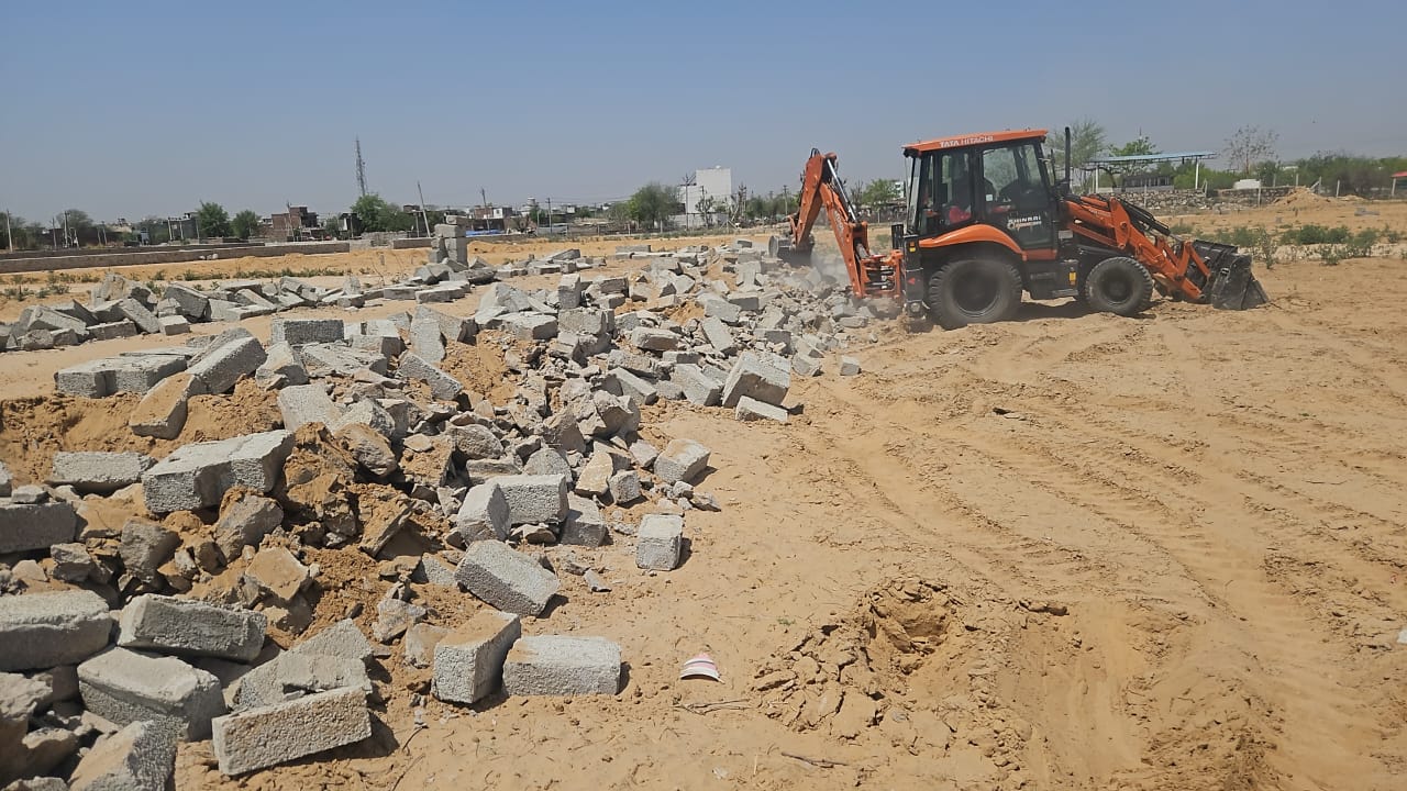 जोन-12 के क्षेत्राधिकार में अवस्थित सिरसी बिंदायका के पास ग्राम निमेडा जिला जयपुर में करीब 08 बीघा निजी खातेदारी कृषि भूमि पर जेडीए की बिना स्वीकृति-अनुमोदन के एवं बिना भू रूपान्तरण करवायें भूमि को समतल कर ‘‘बजंरग वाटिका’’के नाम से बनाई गई मिटटी-ग्रेवल सडके, बाउड्रीवाल, टिनशेडनुमा कोठरी व अन्य अवैध निर्माण कर नवीन अवैध कॉलोनी बसाने की सूचना प्राप्त होने पर आज जोन-12 के राजस्व व तकनीकी स्टॉफ की निशादेही पर प्रवर्तन दस्ते द्वारा जेसीबी मशीन व मजदूरों की सहायता से प्रारिम्भक स्तर पर ही ध्वस्त किया जाकर नवीन अवैध कॉलोनी बसाने के प्रयास को विफल किया गया। जविप्रा द्वारा ध्वस्तीकरण में हुये 50 हजार रूपये व्यय खर्चे की नियमानुसार संबंधित से वसूली की जावेगी।