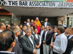 अधिवक्ताओं ने कहा कि कोर्ट परिसर में वकीलों की सुविधा को लेकर आपने करोड़ों रुपए खर्च किए हैं इसलिए हम सभी अधिवक्ता आपका साथ देंगे। अधिवक्ताओं ने एडवोकेट प्रोटेक्शन बिल विधानसभा में पास करने के लिए प्रताप सिंह खाचरियावास का धन्यवाद करते हुए कहा कि आपकी सरकार ने बिल पास करके हमारी मांगे पूरी कर दी,भाजपा ने हमारा साथ नहीं दिया, भाजपा के इशारे पर राजस्थान के राज्यपाल ने एडवोकेट प्रोटेक्शन बिल पास करने की बजाय अटका कर केंद्र को भिजवा दिया,वकीलों ने कहा कि भाजपा के जो भी नेता कोर्ट में आएंगे उनसे यह सवाल खड़े करके वकील अपना विरोध व्यक्त करेंगे और एडवोकेट भाजपा को वोट नहीं देंगे।