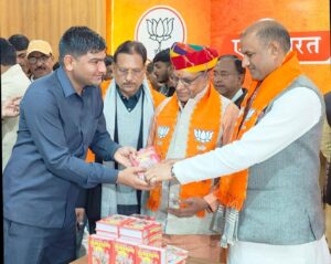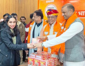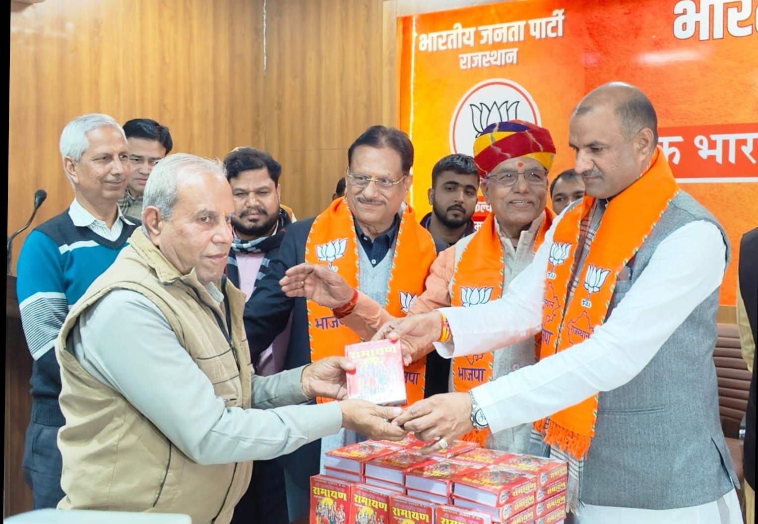 जयपुर(सुनील शर्मा) भाजपा प्रदेश अध्यक्ष सीपी जोशी ने अयोध्या में बन रहे भव्य राम मंदिर की प्राण प्रतिष्ठा कार्यक्रम के दिन 22 जनवरी को भव्य श्री राम मंदिर के शुभारंभ में सहभागिता निभाने के लिए आज प्रदेश भाजपा कार्यालय में सहयोगी साथियों को रामचरित मानस पुस्तक और दिया बाती भेंट की।